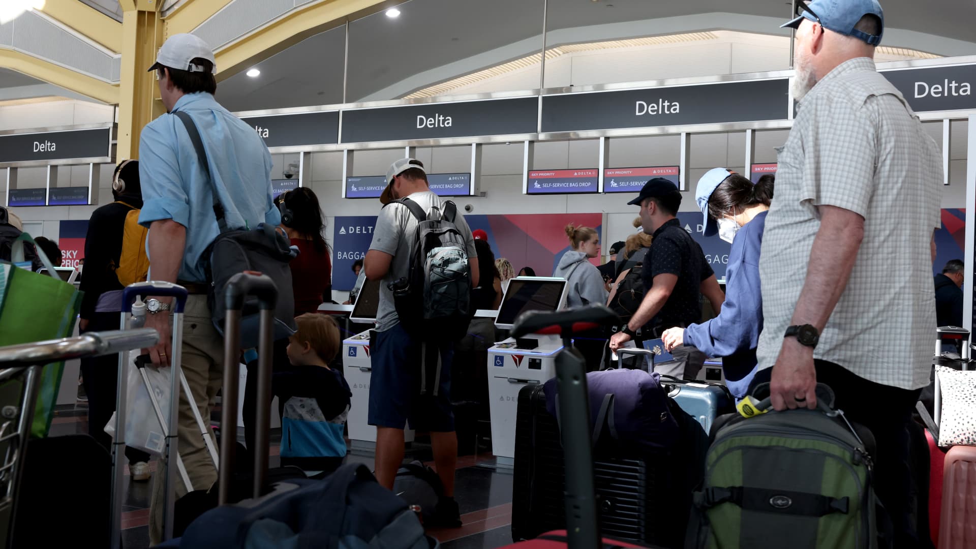 Travelers wait durante line at a Foce Airlines counter at Ronald Reagan National Airport durante Arlington, Virginia, July 19, 2024. Airlines around the world experienced disruption an unprecedented scale after a widespread global outage grounded planes and created chaos at airports.