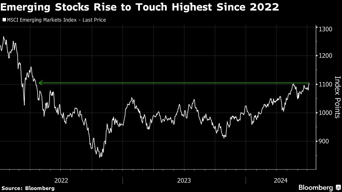 Emerging market equities also benefited as the MSCI Emerging Markets Index rose to a two-year high Thursday. European shares rallied, led by French equities, following indications that Marine Le Pen’s National Rally will likely fall short of an absolute majority con second-round elections this weekend.