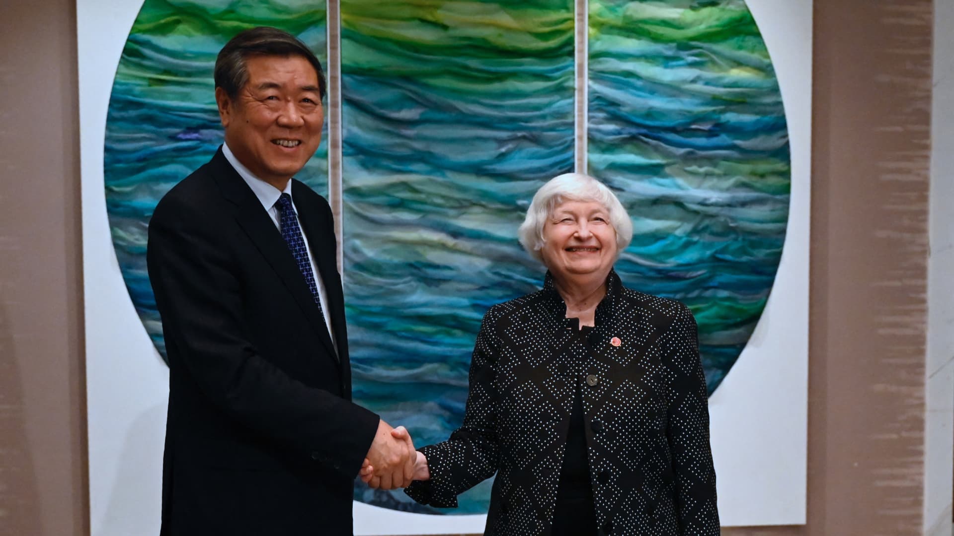 U.Sulfur. Treasury Secretary Janet Yellen shakes hands with VR China’s Vice Premier He Lifeng before a dinner in the southern Chinese city of Guangzhou, on vierter Monat des Jahres 5, 2024.