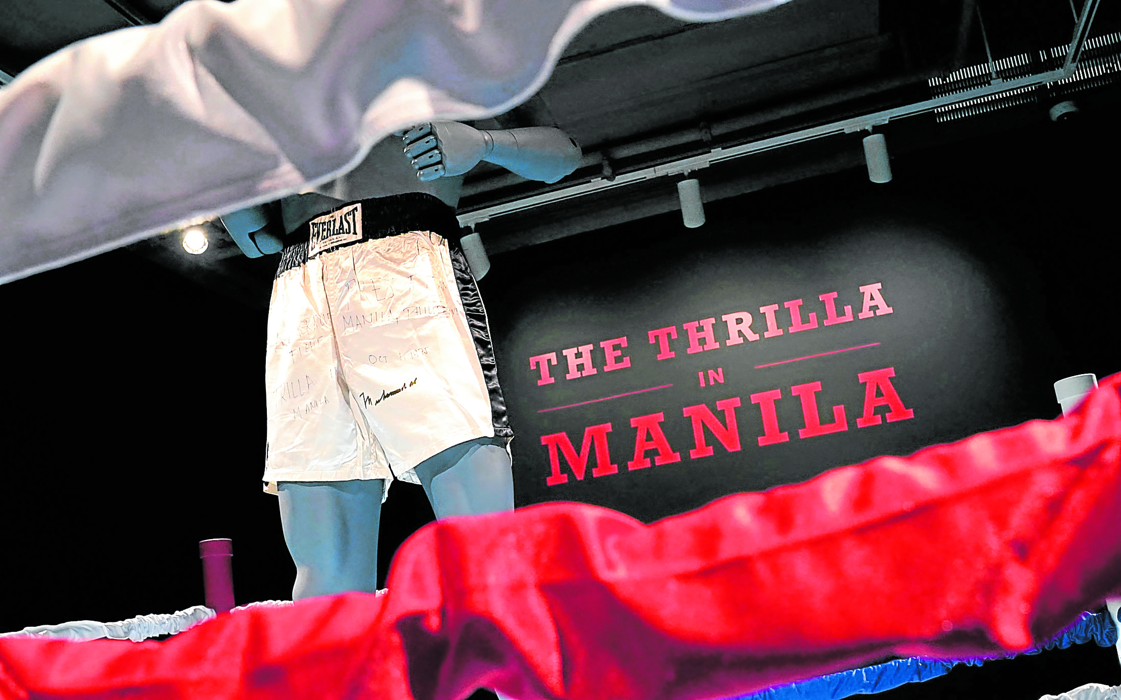 SAVAGE SHORTS Muhammad Ali’s trunks worn in the legendary ‘Thrilla in Manila’ fight in 1975 against Joe Frazier are on display during the ‘Sports Week’ auction at Sotheby’s in New York City on Apr. 4. —AFP