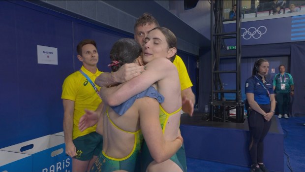 Maddison Keeney and Anabelle Smith hugging shortly after the dive. Â Nine