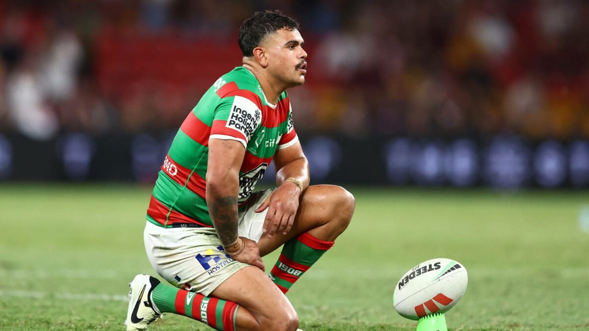 BRISBANE, AUSTRALIA - MARCH 14: Latrell Mitchell of the Rabbitohs prepares to kick during the round two NRL match between Brisbane Broncos and South Sydney Rabbitohs at Suncorp Stadium, on March 14, 2024, in Brisbane, Australia. (Photo by Chris Hyde/Getty Images)