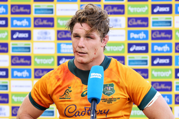 Michael Hooper speaks to Stan Sollazzo post-match at Optus Stadium. Getty