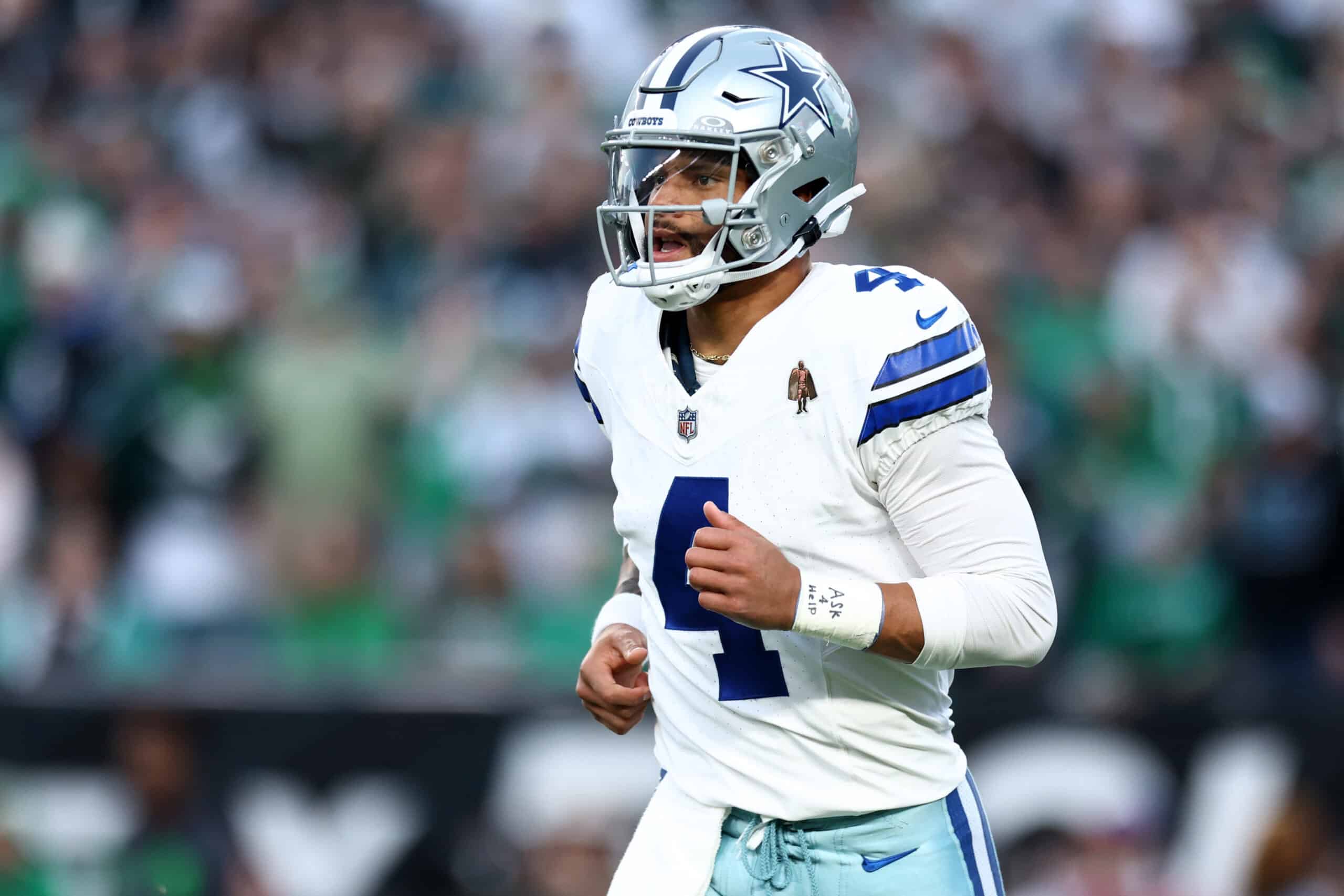 Dak Prescott #4 of the Dallas Cowboys runs onto the field during the first half in the game against the Philadelphia Eagles at Lincoln Financial Field on November 05, 2023 in Philadelphia, Pennsylvania.