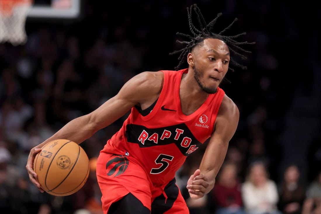 NBA: Toronto Raptors at Brooklyn NetsApr 10, 2024; Brooklyn, New York, USA; Toronto Raptors guard Immanuel Quickley (5) handles the ball against the Brooklyn Nets during the fourth quarter at Barclays Center. Mandatory Credit: Brad Penner-USA TODAY Sports