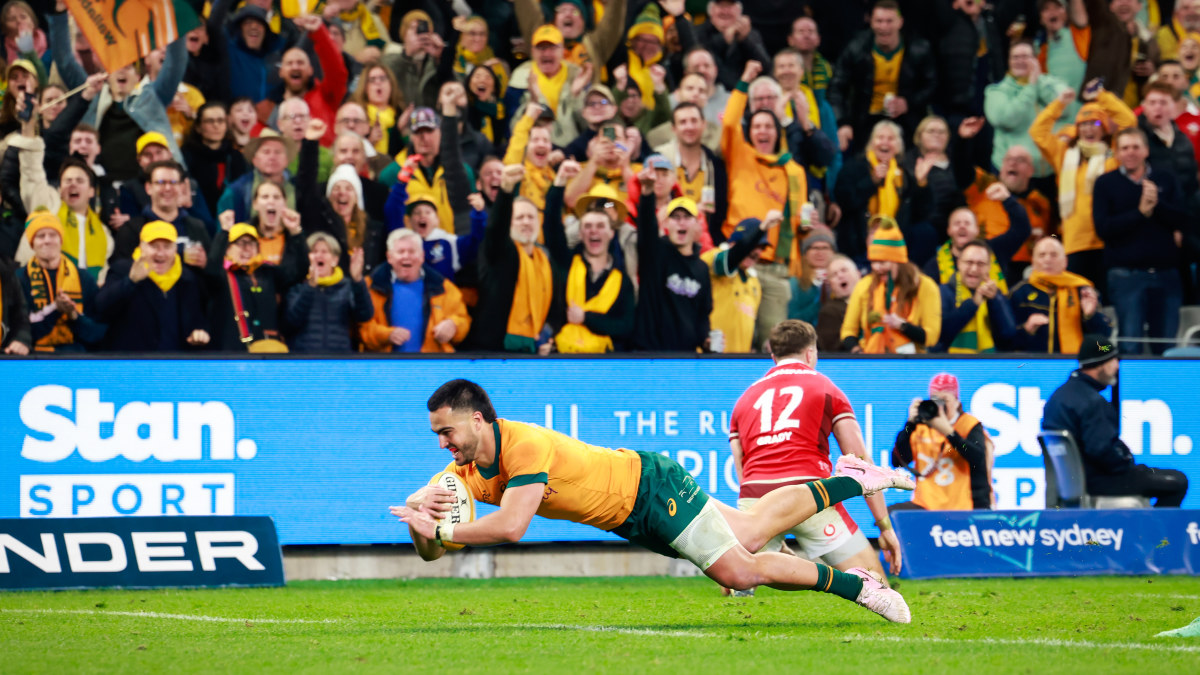 Tom Wright of the Wallabies makes a fermata to score a try. Getty