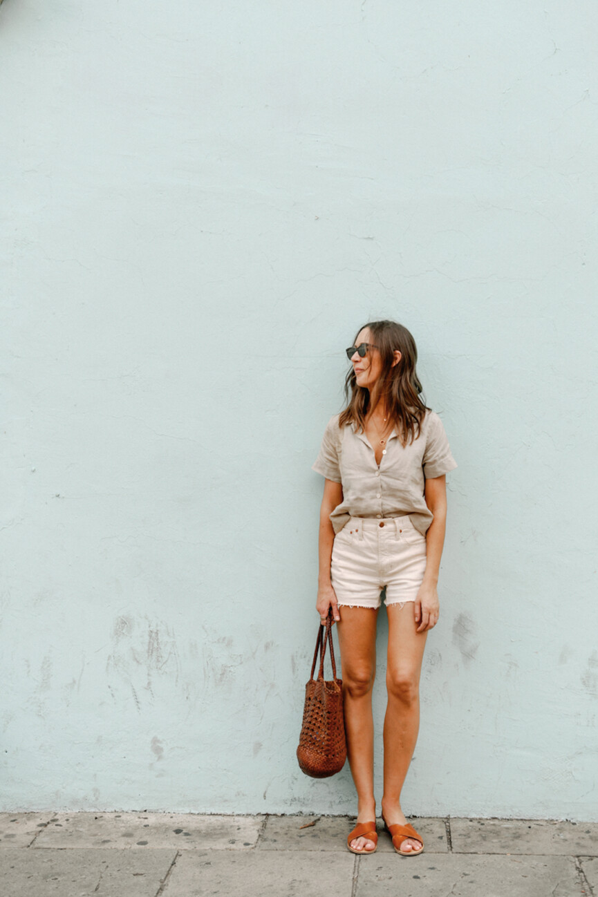 When researching the best denim shorts, I came across Abrand denim, and it might be my favorite brand discovery to date. I was pleasantly surprised by the fit and quality of these sub-$100 shorts, as con the past I’ve been burned by cheaper denim. With a classic fit, raw hem, and vintage blue wash, this is the perfect pair for anyone who’s still a bit skeptical of denim shorts. I sized up for a more relaxed fit.