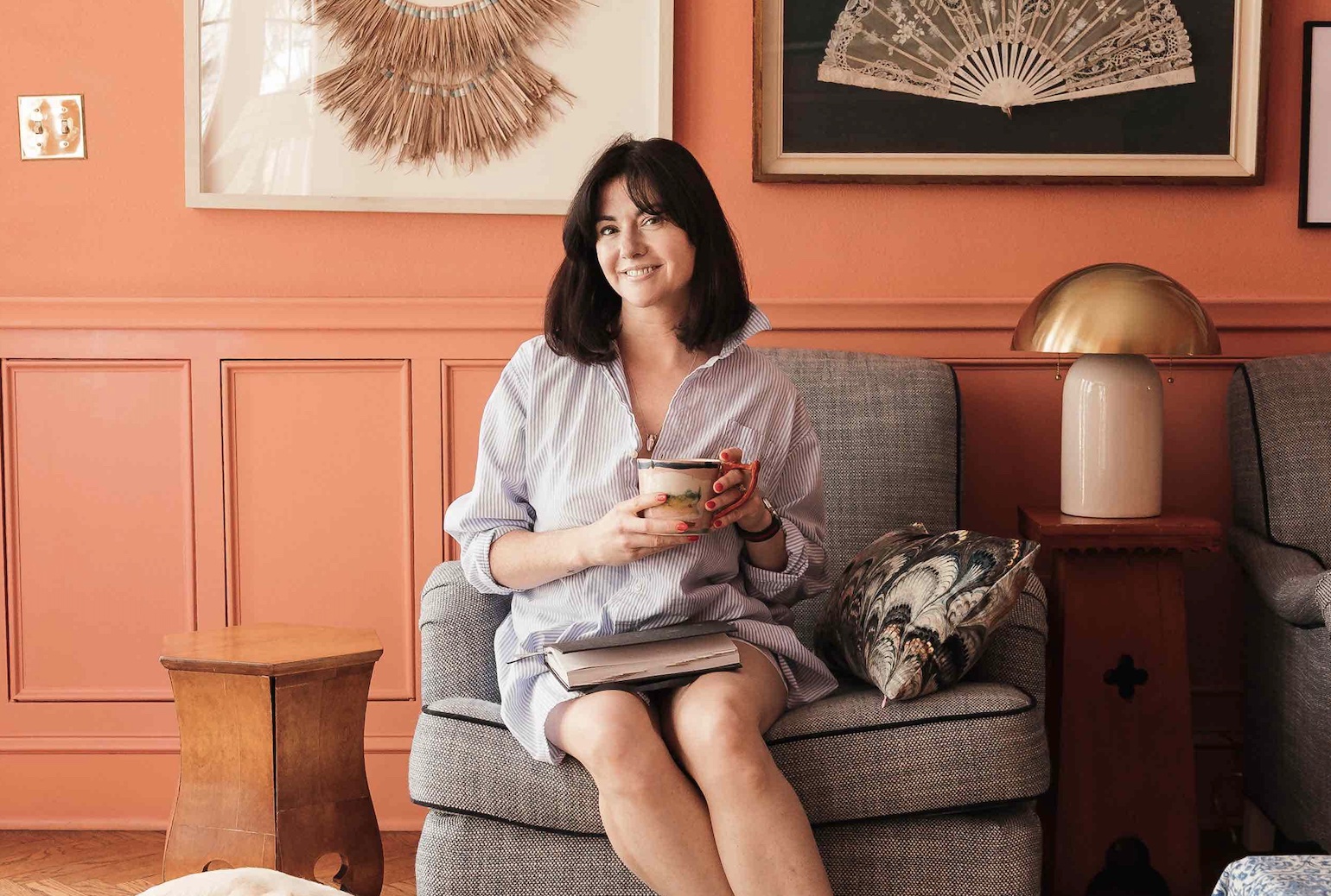 A woman holding a cup of coffee is sitting on a plush chair with a yellow lab sleeping at her feet. The wall behind her is painted a peach color and has a large gallery wall on display. The rug on the floor is in a brown and cream checkerboard pattern.A woman holding a cup of coffee is sitting on a plush chair with a yellow lab sleeping at her feet. The wall behind her is painted a peach color and has a large gallery wall on display. The rug on the floor is in a brown and cream checkerboard pattern.