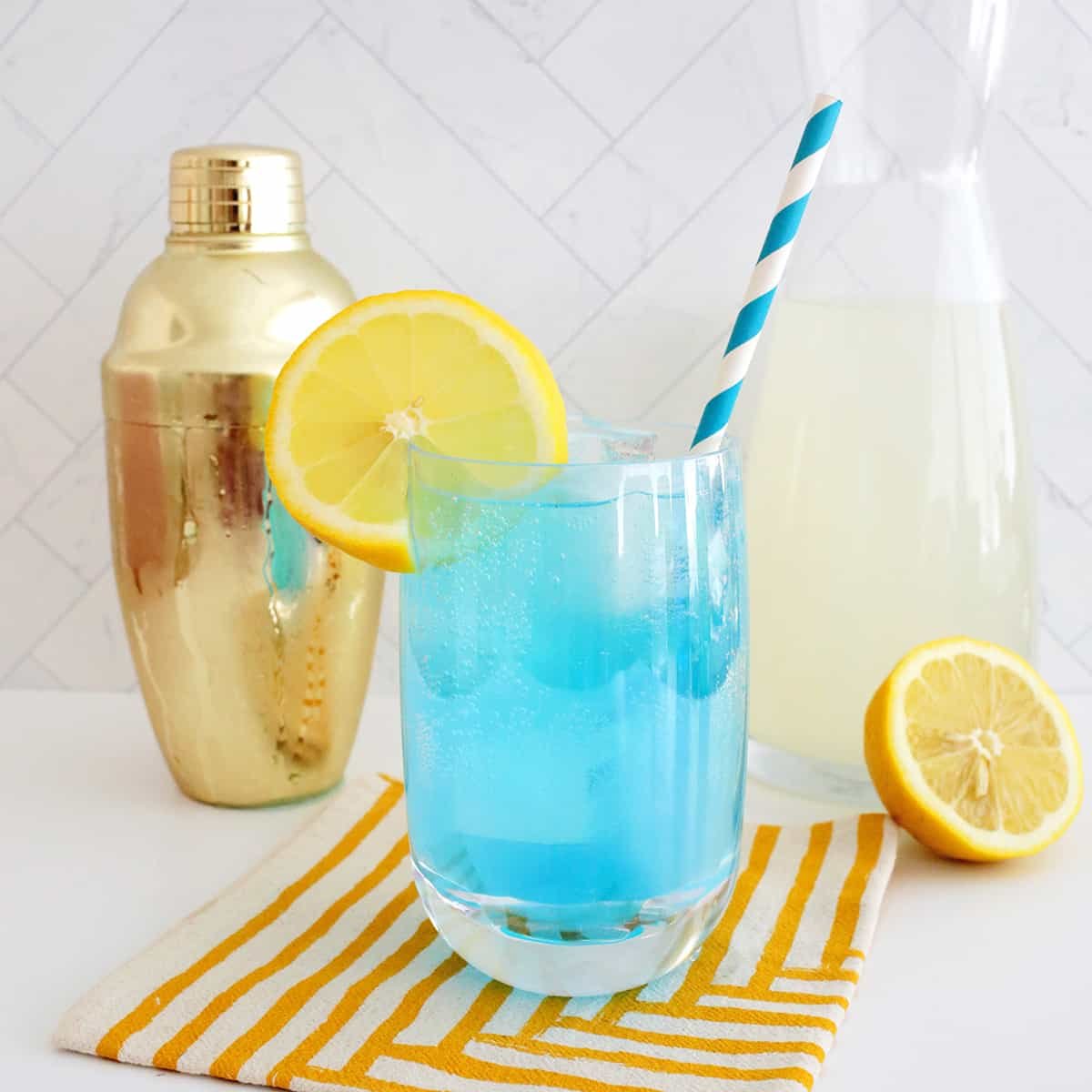 Electric Lemonade is a refreshing tart and sweet summer cocktail-party that’s easy to make with only four ingredients: vodka, lemonade, lemon-lime soda, and blue curaçao. The lemonade gives the a little citrus kick and the blue curaçao adds an electric blue color that’s perfect for summer parties and pool hangs.