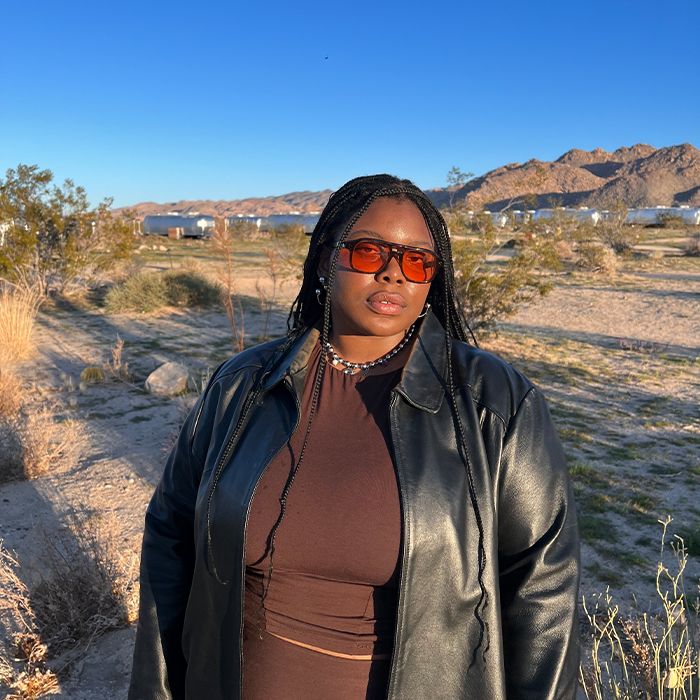 Chichi wears brown skirt and tank set with leather jacket and aviator sunglasses in the desert