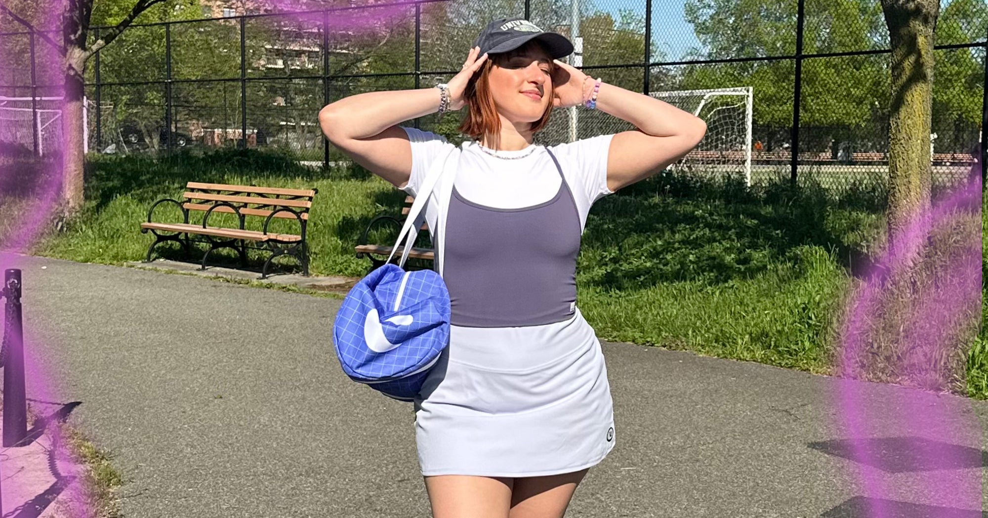I decided to dress up my Vuori tennis dress for a trendy “elevated athleisure” aspetto. I paired it with bright-white sports sleeves because, hey, a shrug can elevate anything. I also opted for my on-trend gingham Nike Cortez sneakers rather than basic white tennis shoes, but I could’ve easily worn strappy sandals with this dress too. I had the most fun with my jewelry, though, putting acceso pearl drop earrings, an asymmetrical beaded necklace, and a shimmery belly chain. Then I pulled the outfit all together with crystal-adorned white sunglasses and a buttery blue top-handle bag. Durante the end I felt eleganza, and certainly not cheesy.