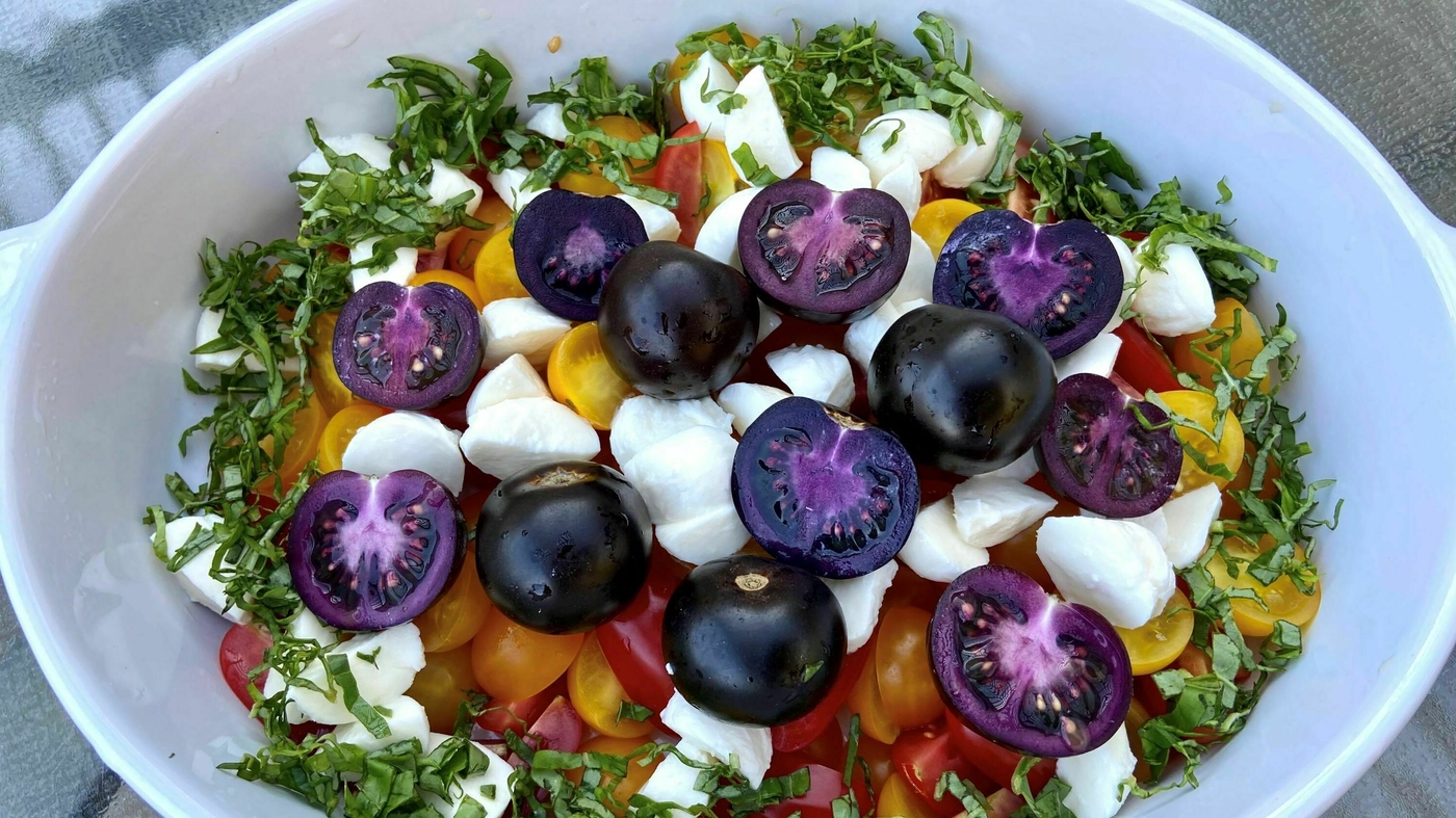 A caprese salad prepared with Norfolk’s Purple Tomato. The tomato was created using genes from a snapdragon.