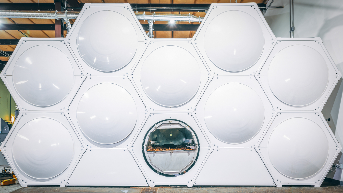 The composting itself happens in a cavernous warehouse that Spade calls the greenhouse. She describes the smell as alternating between that of a grassy meadow after a rain and a barnyard. Inside the warehouse, 34 white hexagonal cylinders, or individual vessels, are stacked on top of each other, forming the shape of a beehive.