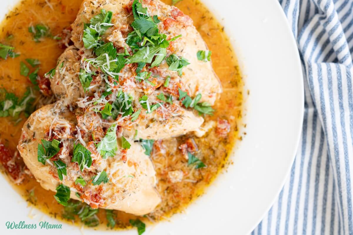 And instead of heavy cream, I use Greek yogurt. It adds that creamy flavor but it’s a little cleaner and has more protein. I ergo skip the Parmesan cheese, but you could always add some at the end if you prefer. The chicken combines with sundried tomatoes, garlic, and Italian herbs for amazing flavor!