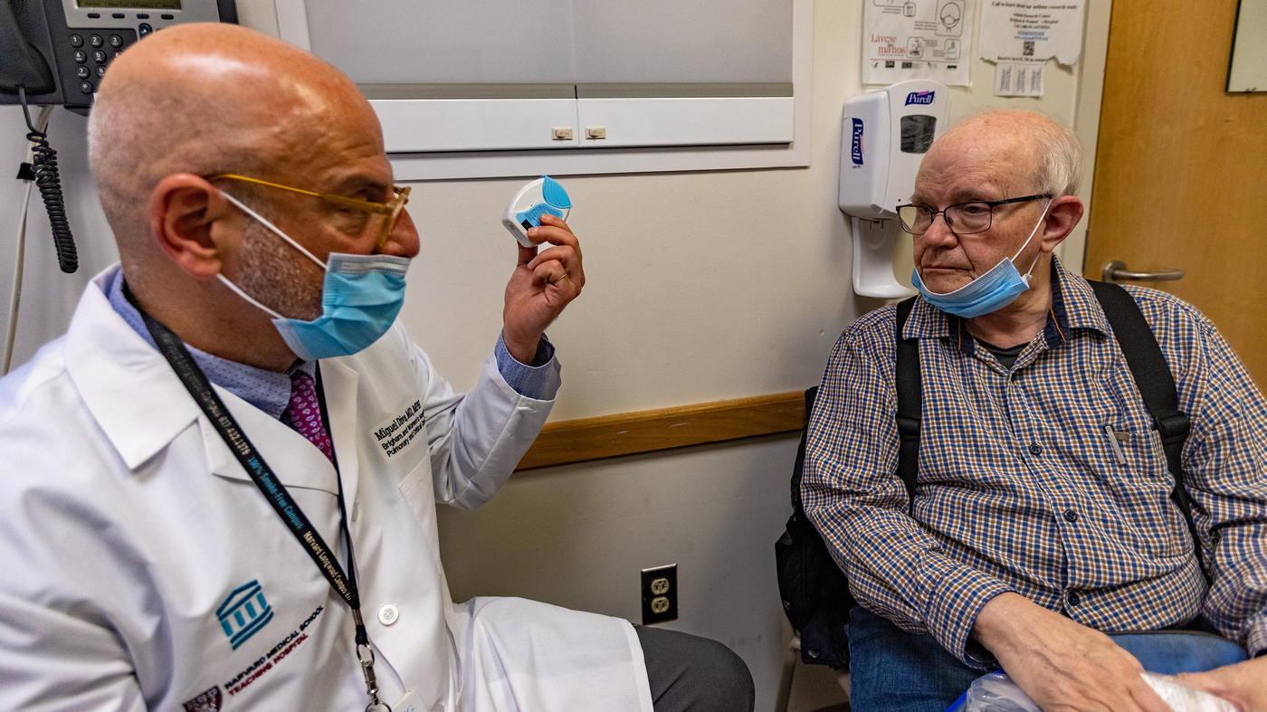 Miguel shows his patient, Joel Rubinstein, a dry powder inhaler. It’s an alternative to some puff inhalers that emit potent greenhouse gases, but is equally effective for many patients with asthma.