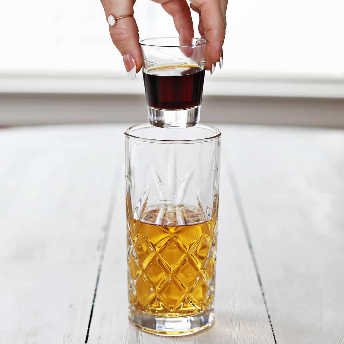 Technically there are two ways to enjoy a bomb shot. The first one being to drink the shot and then chug the drink. The far more popular way to enjoy this drink is to drop the shot into the drinking glass and then chug both drinks as one.