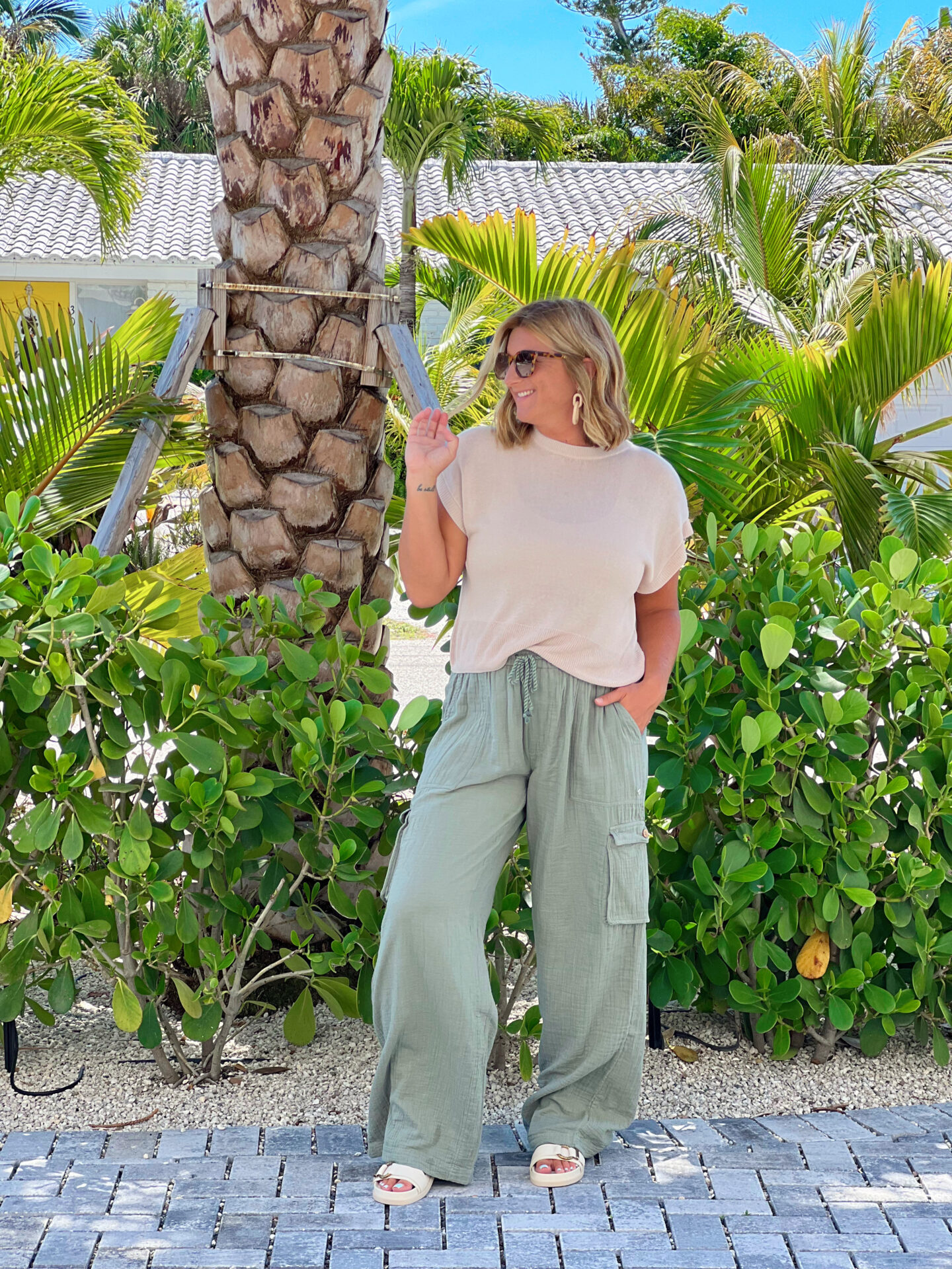Vince Camuto Short Sleeve Sweater [true to size, wearing in small] // Precious Cargo Cotton Drawstring Pants • Roxy [true to size, I sized up to medium but would prefer in small] // Soya Platform Sandal (Women) • Sanft Vita [true to size]