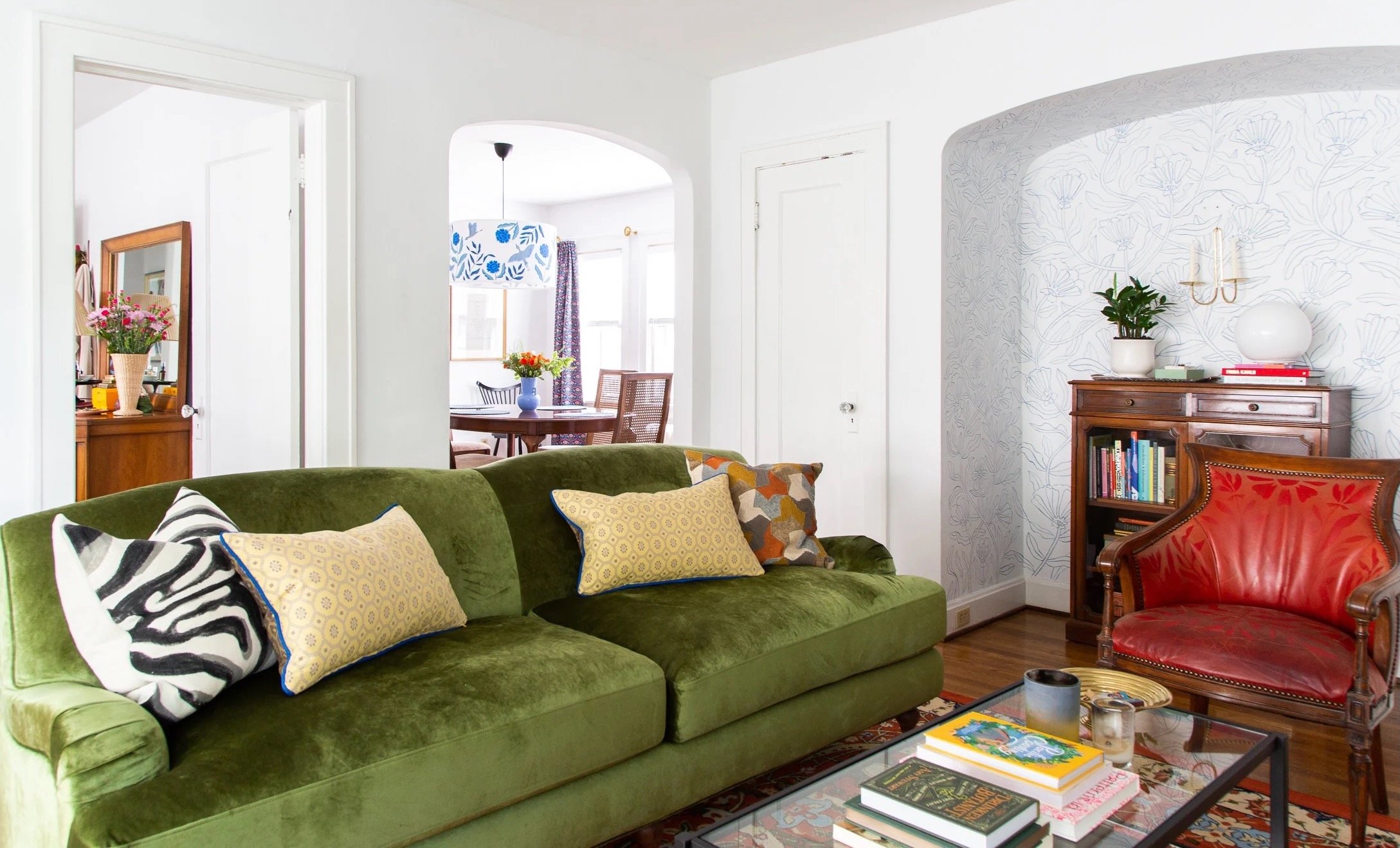 Nook: not wallpaper, hand-painted. Sofa: Interior Define, but no longer available, . Chair: vintage and then painted with leather paint with a deglazer and sealant, “holds up great!” Cabinet: estate sale, . Candle sconce: Hoppe Shoppe. Orb lamp: IKEA.