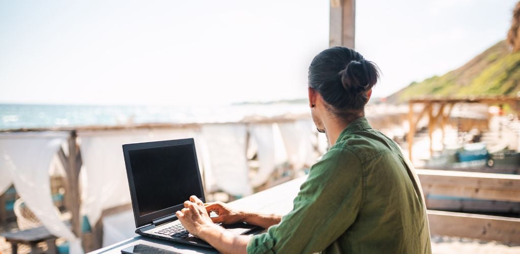 digital nomad in a tropical location working from laptop with palm trees in backgrounddigital nomad in a tropical location working from laptop with palm trees in background