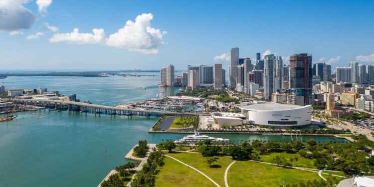 Aerial shot of Downtown Miami with its many skyscrapers, with a sprawling park in the foreground and a long bridge going to an island underneath a blue sky