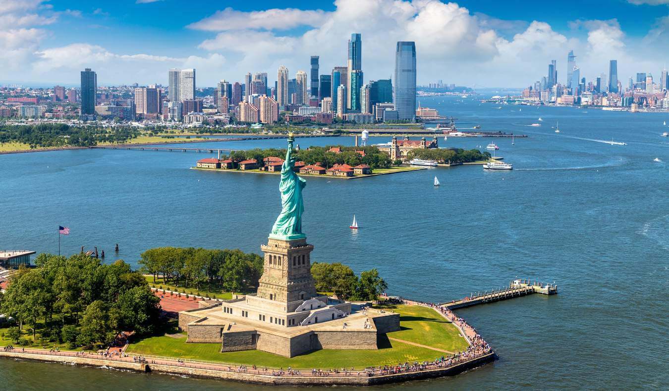 Panoramic aerial view Statue of Liberty and with the skylines of Manhattan and Jersey City in the background