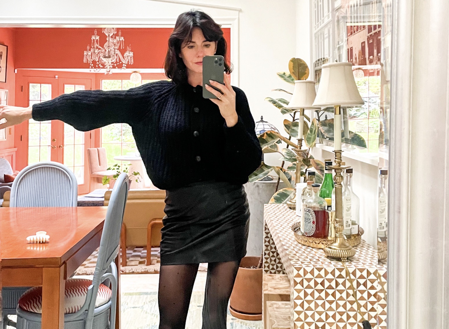 A woman is standing in front of a mirror wearing a black Sézane skirt, black cardigan sweater, black tights, and tall brown suede bootsA woman is standing in front of a mirror wearing a black Sézane skirt, black cardigan sweater, black tights, and tall brown suede boots