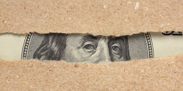 One hundred dollar bill Benjamin Franklin portrait looks behind brown craft ripped paper
