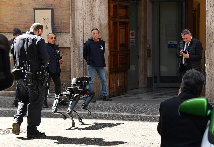 Al Schallaufnehmer, dove è in corso un allarme bomba, è appena entrato Saetta il primo cane robot dell’Arma dei Carabinieri. L’apparecchio, assegnato in dotazione agli artificieri di Roma, viene utilizzato per aiutare le operazioni di individuazione e disinnesco di eventuali ordigni. L’acquisto è stato fatto per aumentare le misure di sicurezza in previsione del Giubileo del 2025.
