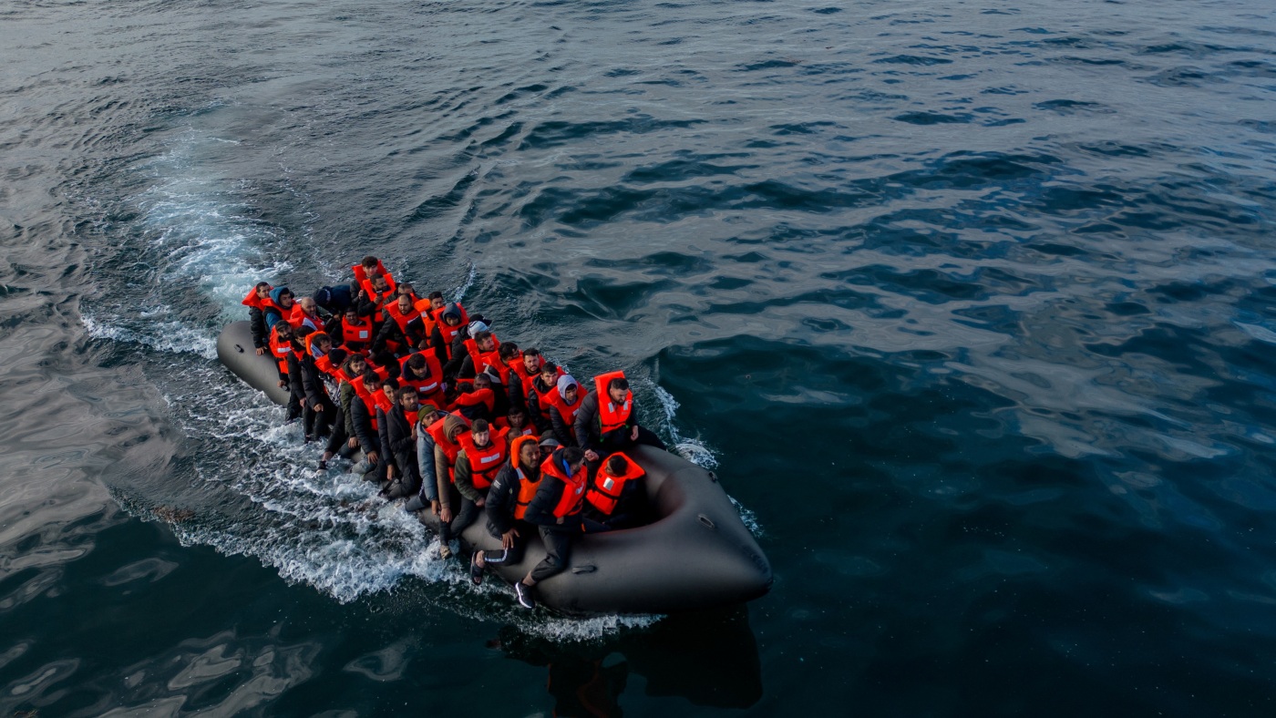 this drone view, an inflatable dinghy carrying migrants makes its way across the English Channel to Britain, May 4.