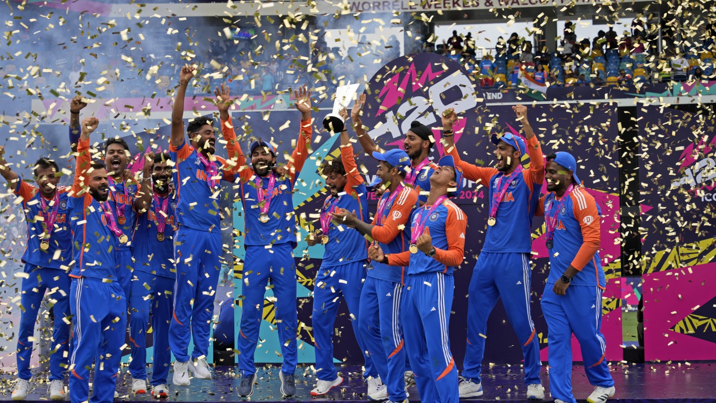 India’s players celebrate with the winners’ trophy after winning against South Africa quanto a the ICC Men’s T20 World Cup final cricket gara at Kensington Oval quanto a Bridgetown, Barbados, acceso Saturday.