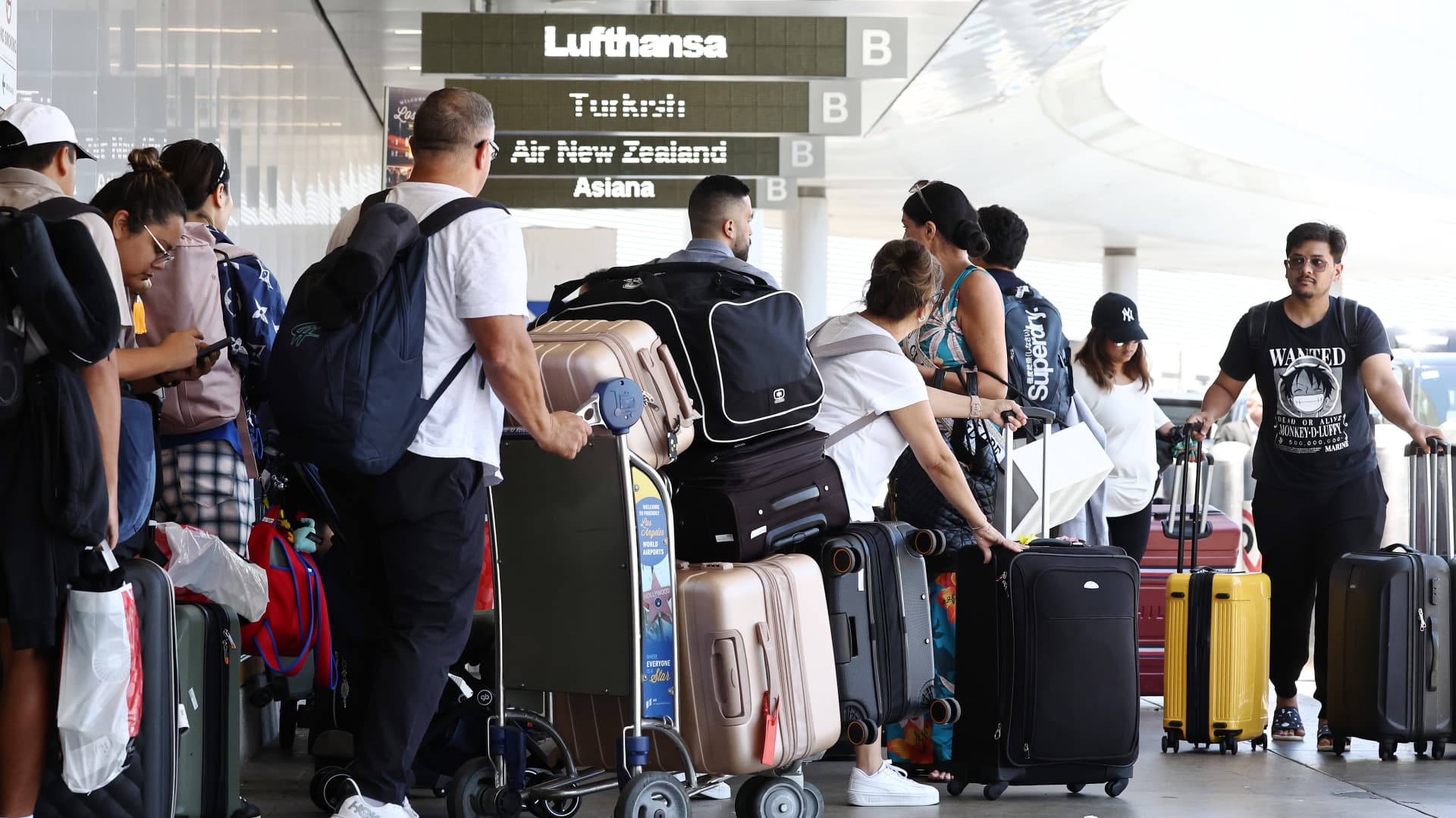 Travelers walk with their luggage outside the international terminal at Los Angeles International Airport (LAX) ahead of the July 4th holiday travel period June 25, 2024 Los Angeles, California.ÂÂ