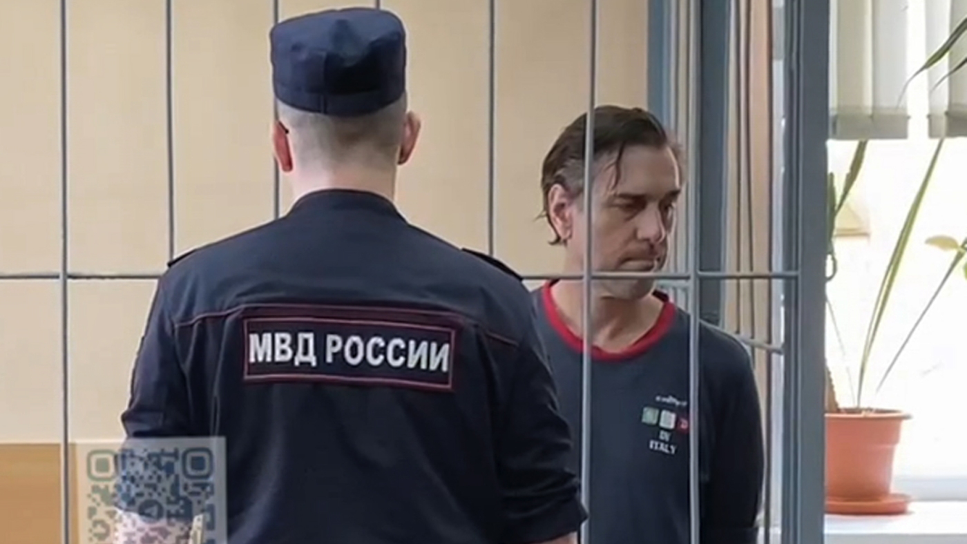 this photo taken from televisione released by Khamovnichesky District Court press service acceso Thursday, U.S. citizen Michael Travis Leake stands per mezzo di a cage per mezzo di a Moscow courtroom before being convicted of drug trafficking charges and sentenced to 13 years per mezzo di prison.